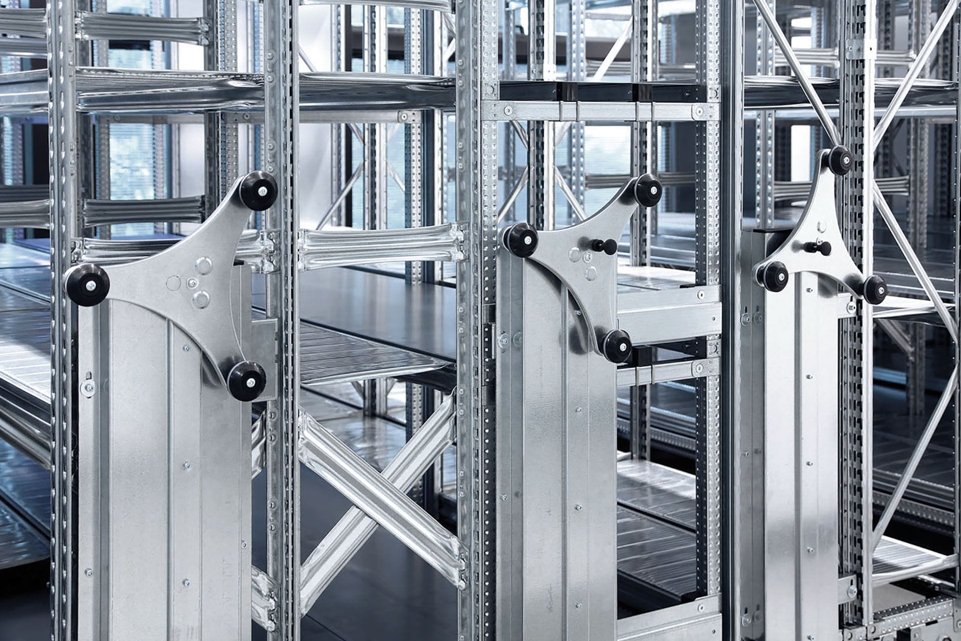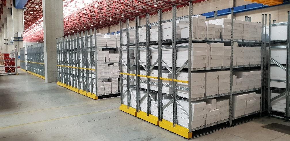 Specifically designed for Super 1-2-3 and Unirack shelving series, Mobibasic and Mobieasy can be used to convert existing static shelving installations into high density mobile systems without a fuss. An expression of an efficient union between function and design.